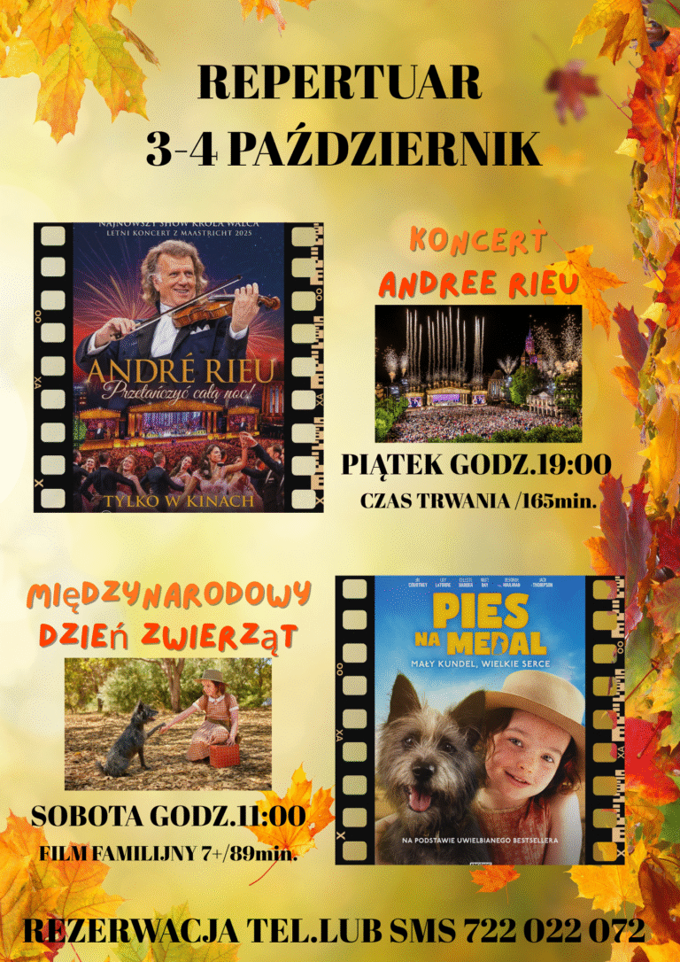 REPERTUAR 🍂REPERTUAR 3-4 PAŹDZIERNIK🍁 🎫Koszt biletu 10zł.-ulgowy, 12zł.-normalny 🎻Koncert -40zł. 📞Rezerwacja tel. lub SMS ☎️722 022 072 🎬Zapraszamy